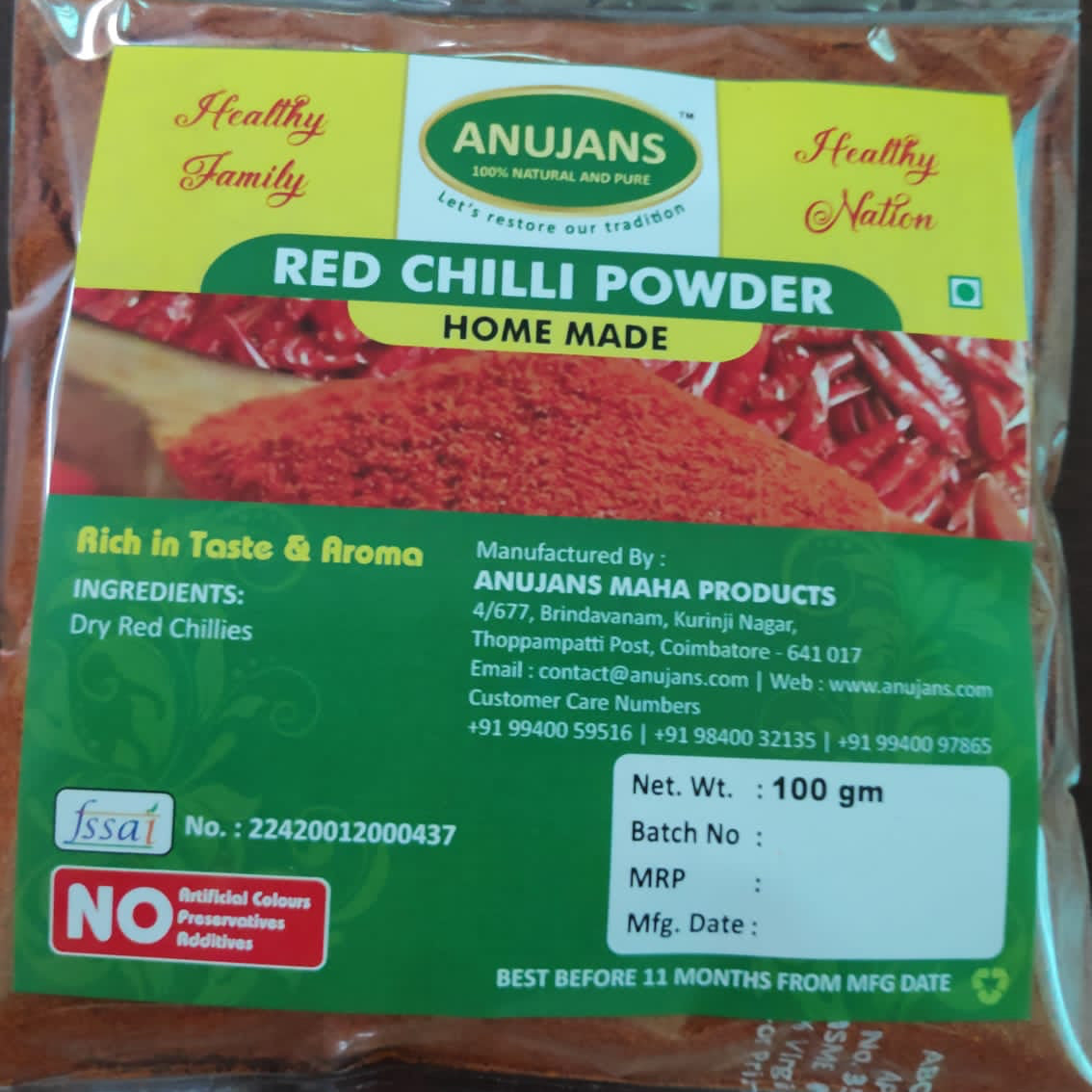 Our ANUJANS Red Chille powder is made from best quality Guntur Red Chillies.